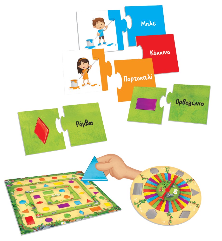 Ένα ταμπλό γεμάτο με συνδυασμούς σχημάτων και χρωμάτων, με δύο διαφορετικούς τρόπους παιχνιδιού, χωρίς ζάρι, αλλά γυρνώντας τον τροχό! Ακόμα, παίξετε και συνδυάστε τα κομμάτια παζλ με τις δραστηριότητες που βρίσκονται μέσα στον Παιδαγωγικό Οδηγό, ο οποίος είναι γραμμένος σύμφωνα με το νέο Πρόγραμμα Σπουδών του Υπουργείου Παιδείας.