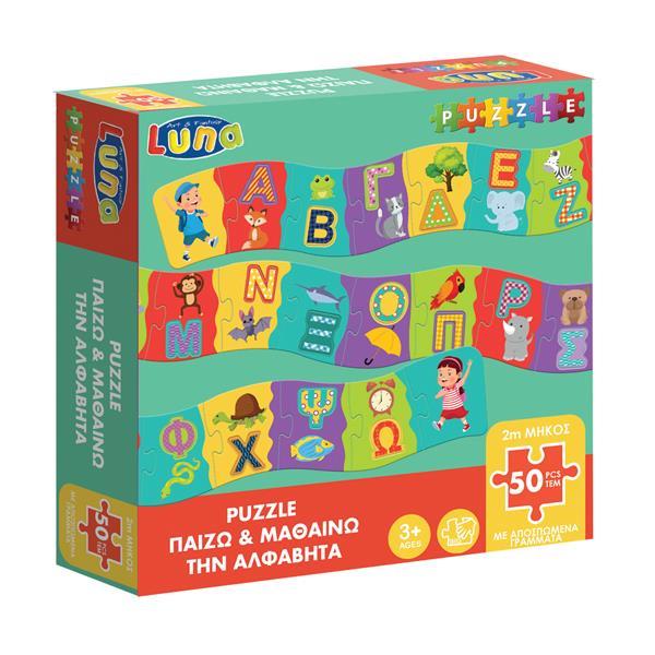 Παζλ δαπέδου με τα γράμματα του Ελληνικού Αλφάβητου. Περιέχει 50 τεμ.από ανθεκτικό χαρτόνι. Μήκος παζλ 2 μέτρα.