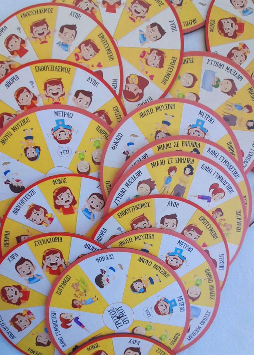 • Σετ 2 τροχών. Ο τροχός των  συναισθημάτων είναι ένα εργαλείο θετικής διαπαιδαγώγησης. Βοηθάει τα παιδιά στην αναγνώριση και κατανόηση των βασικών συναισθημάτων.Ο τροχός του θυμού είναι ένα εργαλείο θετικής διαπαιδαγώγησης. Δείχνει τους αποδεκτούς τρόπους έκφρασης του θυμού.Είναι ξύλινα, πάχος 3 χιλιοστά, διάμετρος 20 εκατοστά.