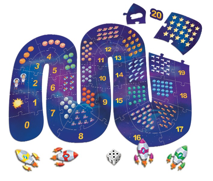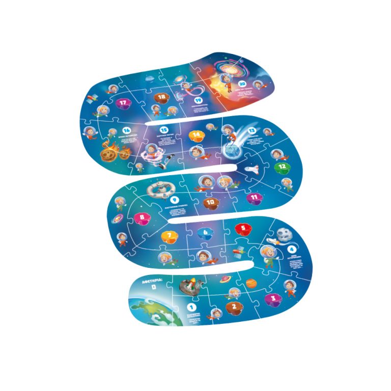 * Φτιάξε το παζλ και από την πίσω πλευρά παίξε ένα διασκεδαστικό διαστημικό “φιδάκι” με φίλους ή την οικογένεια! Ένα παιχνίδι που ενισχύει τις πρώτες μαθηματικές δεξιότητες, τη λογική σκέψη, την παρατηρητικότητα και τη λεπτή κινητικότητα.